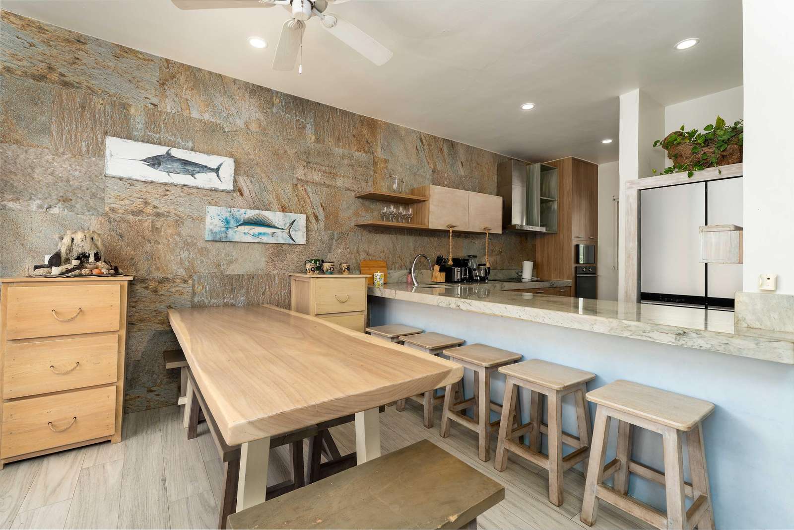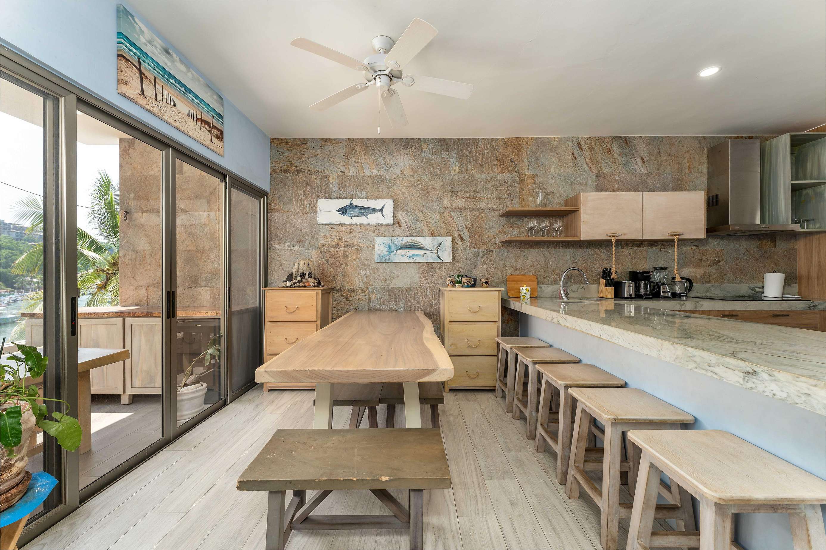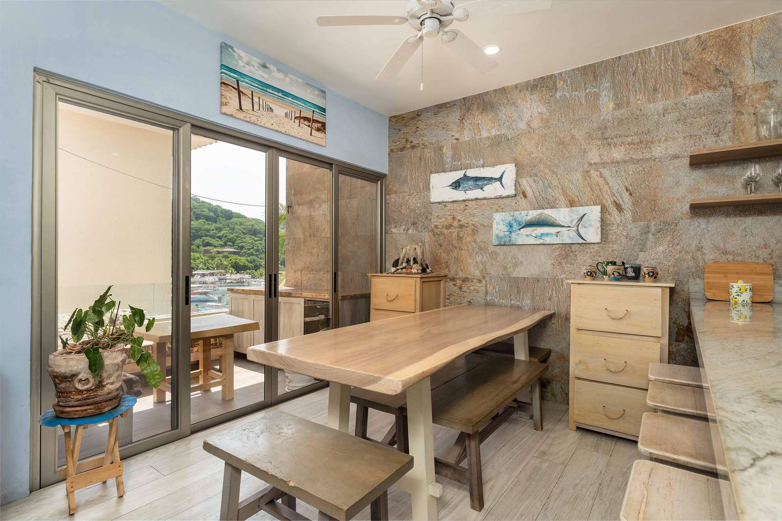 Arrive to a bright open living space filled with natural light with terrace that offers views of the marina. The fully equipped modern kitchen makes it easy to prepare meals while soaking in the vibrant surroundings. There is a large table and bar seating in the dining area. The living room offers comfortable seating and large SMART TV.