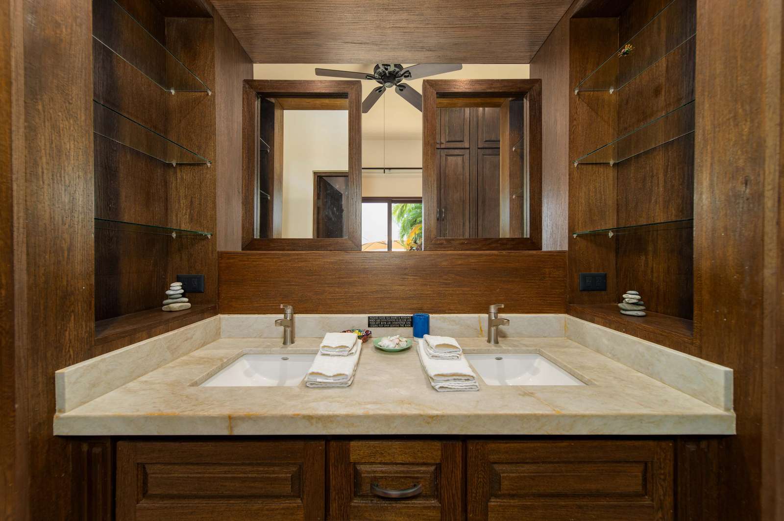 The main-level bedroom includes a king-size bed and an ensuite with dual sinks and a walk-in shower. Upstairs, the second bedroom offers a queen bed and private ensuite, while the spacious master suite features a king bed, dual vanities, a large shower, walk-in closet, and a private terrace—ideal for sipping morning coffee with ocean views. The cozy upstairs den doubles as a fourth sleeping area, with two loveseat-style twin beds, great for kids.