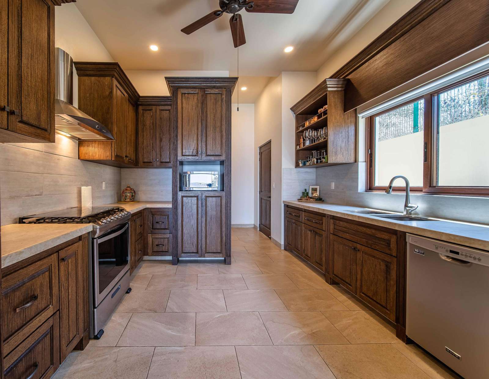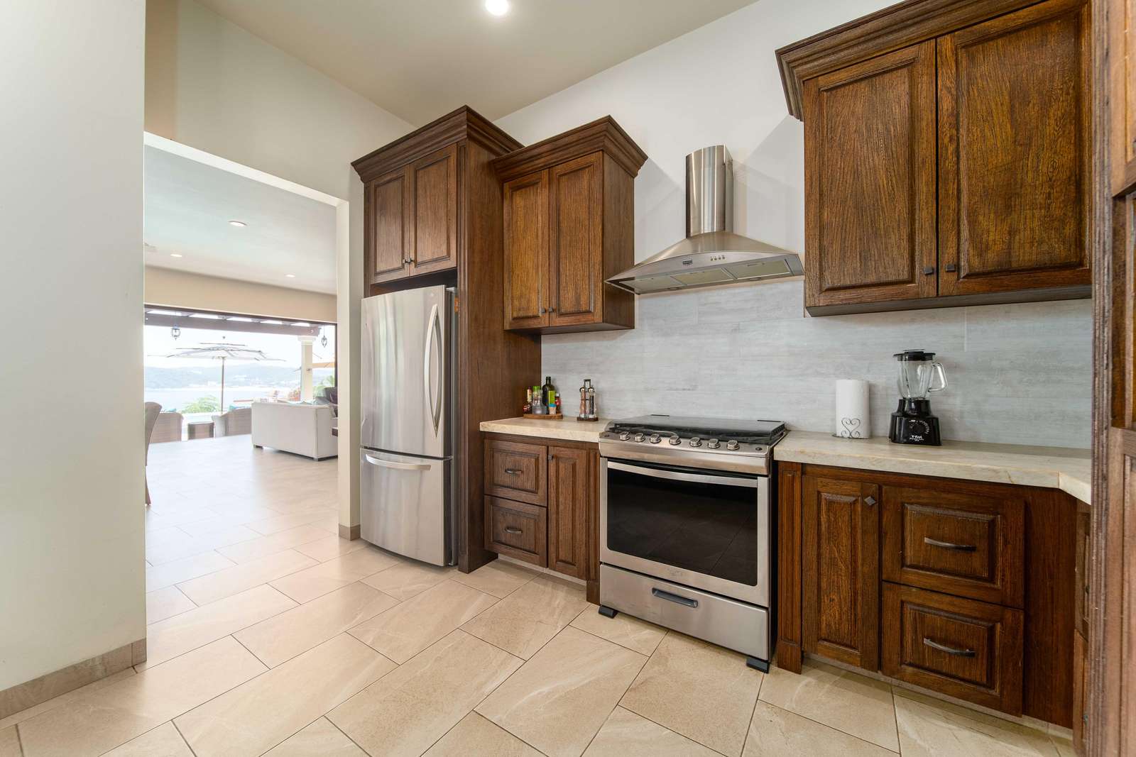 The fully equipped gourmet kitchen boasts granite countertops, top-of-the-line appliances, and everything you need to prepare incredible meals. Step outside to the adjacent terrace with a propane BBQ—perfect for grilling your catch of the day. The open-concept living area features soaring ceilings, elegant décor, and seamless indoor-outdoor flow.