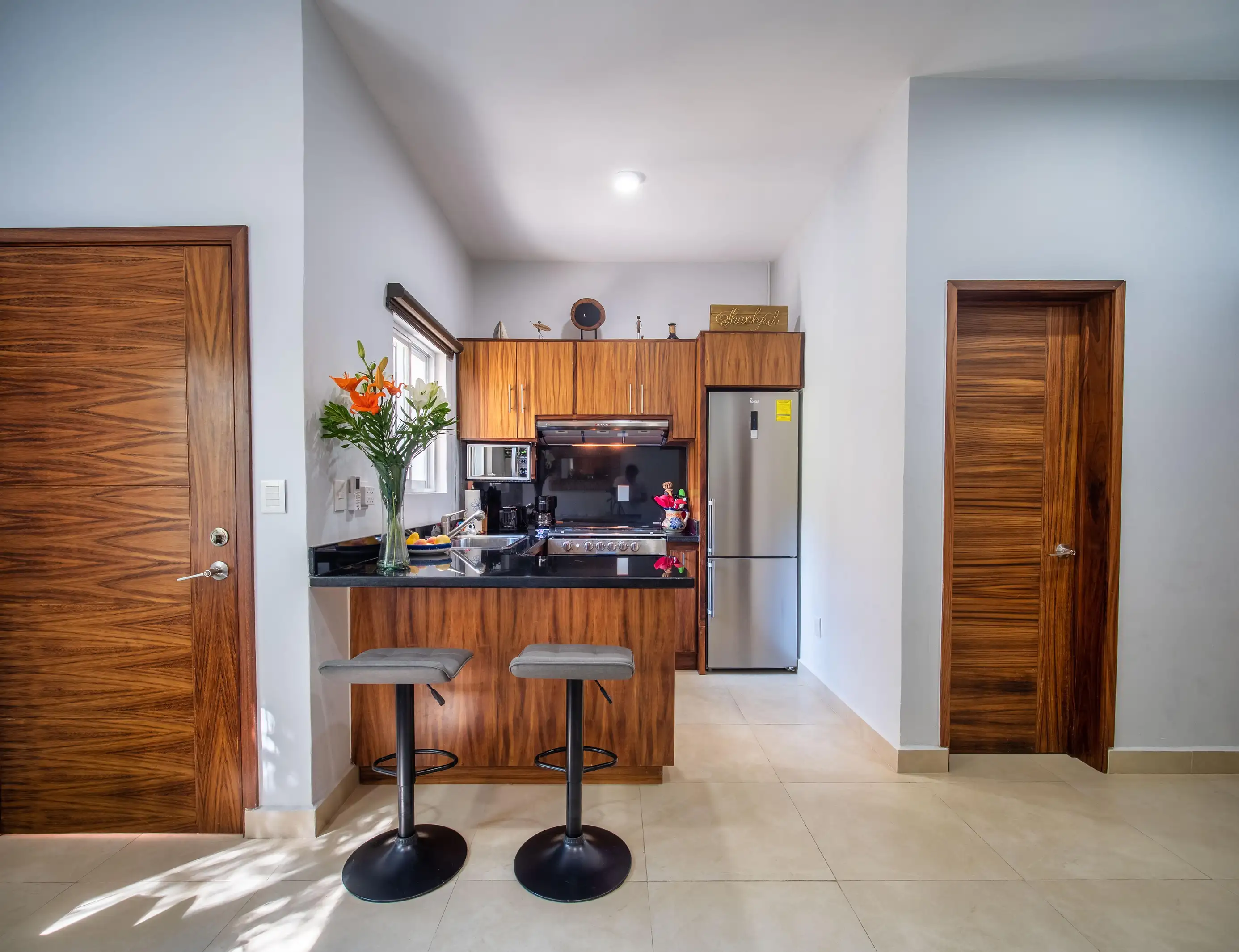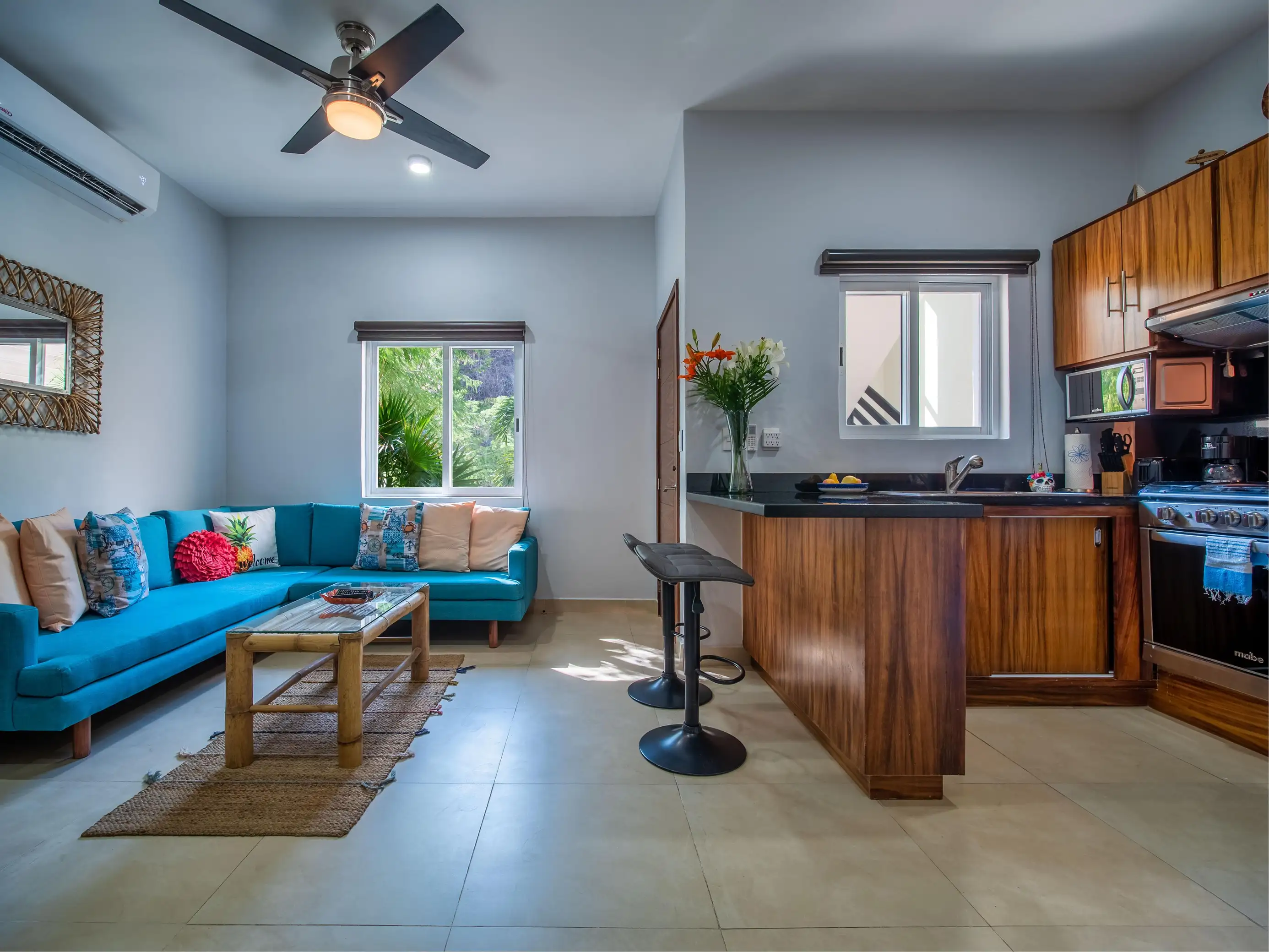 The kitchen is fully equipped with everything you need, including an eating bar for two people. Across from the kitchen is the living room with a comfortable sofa and a SMART TV.