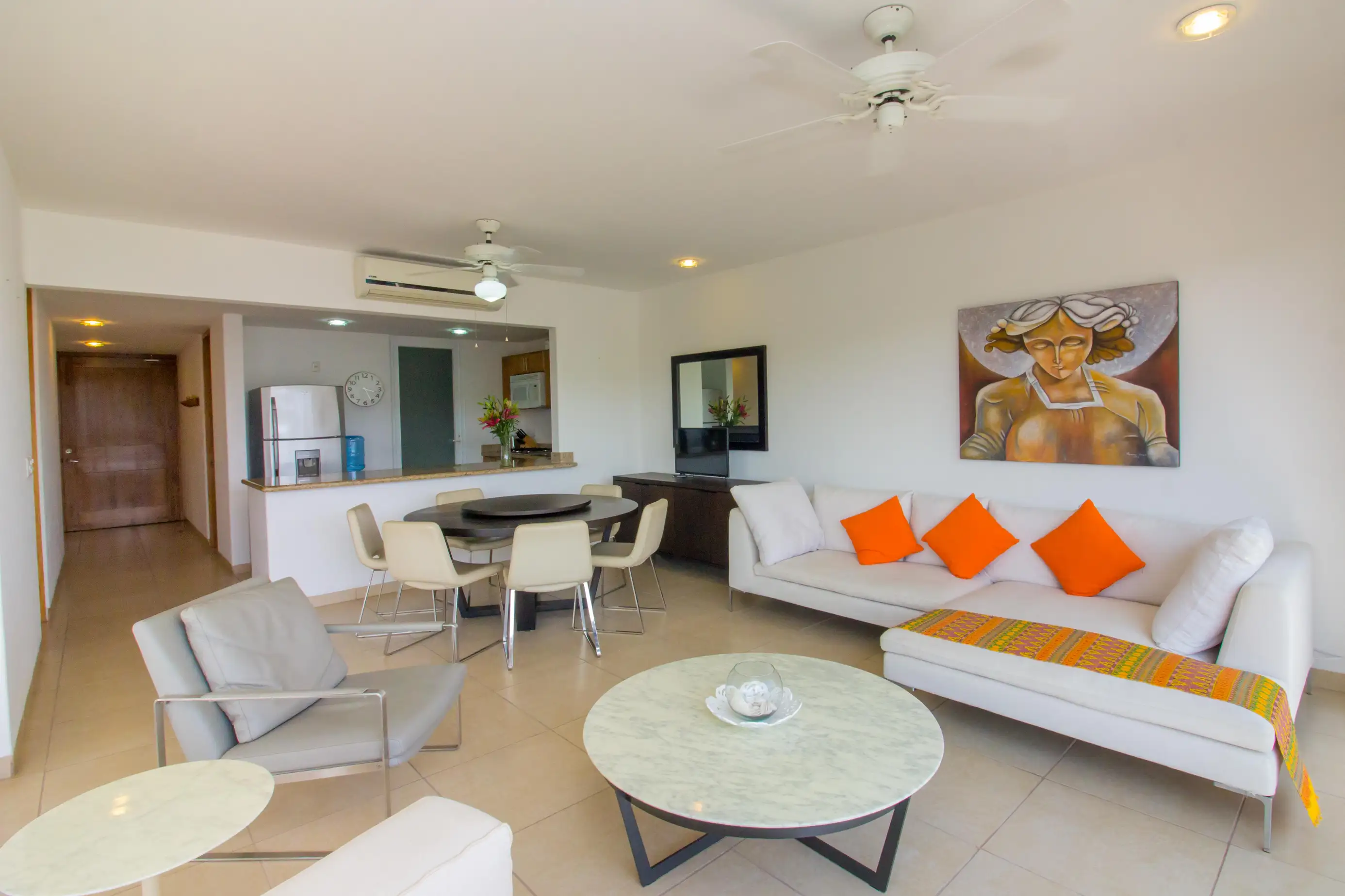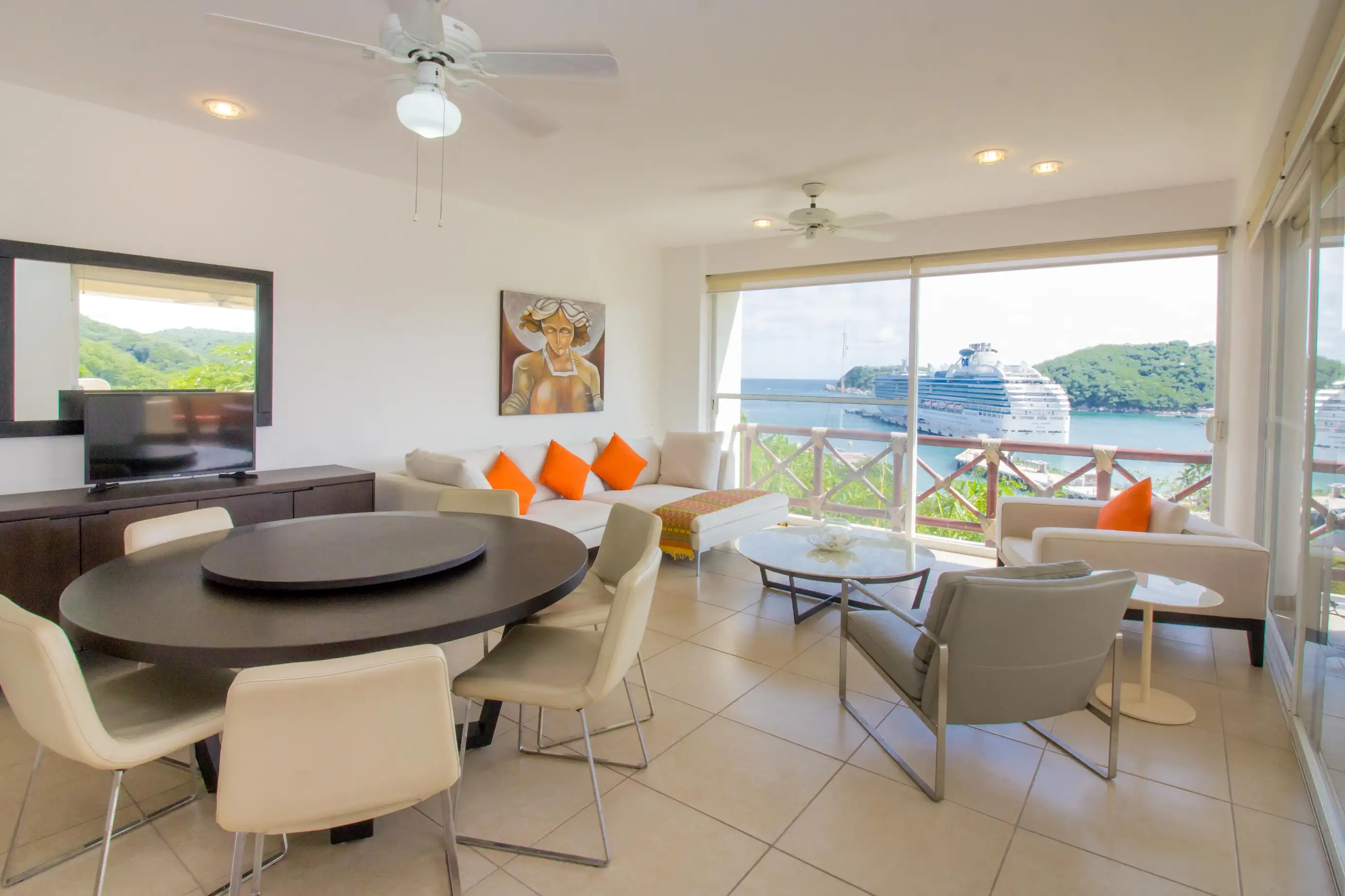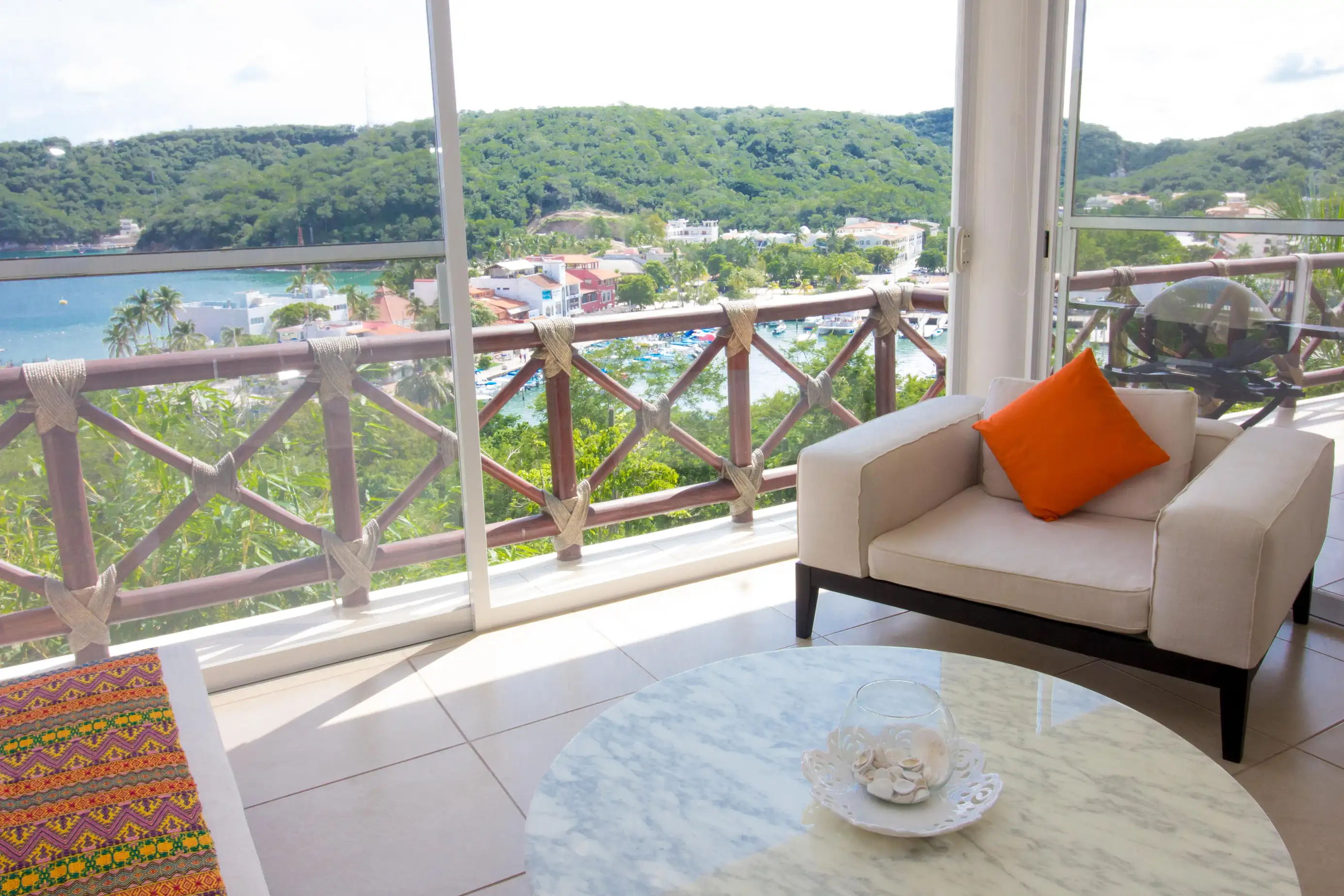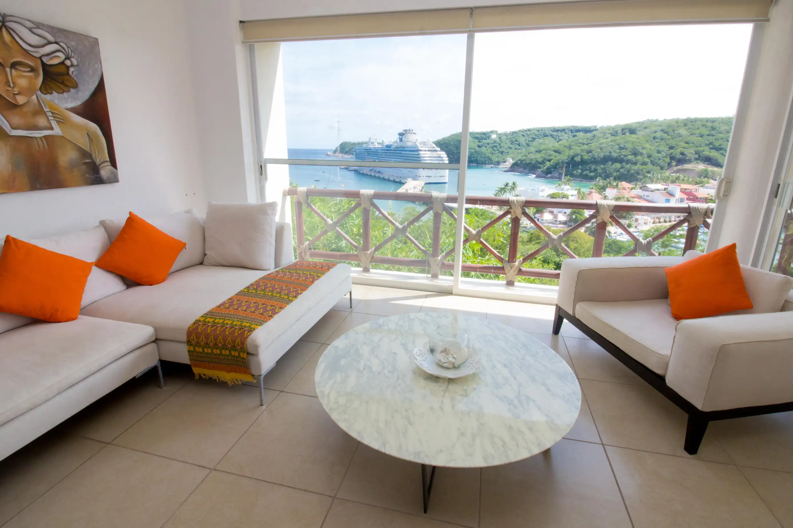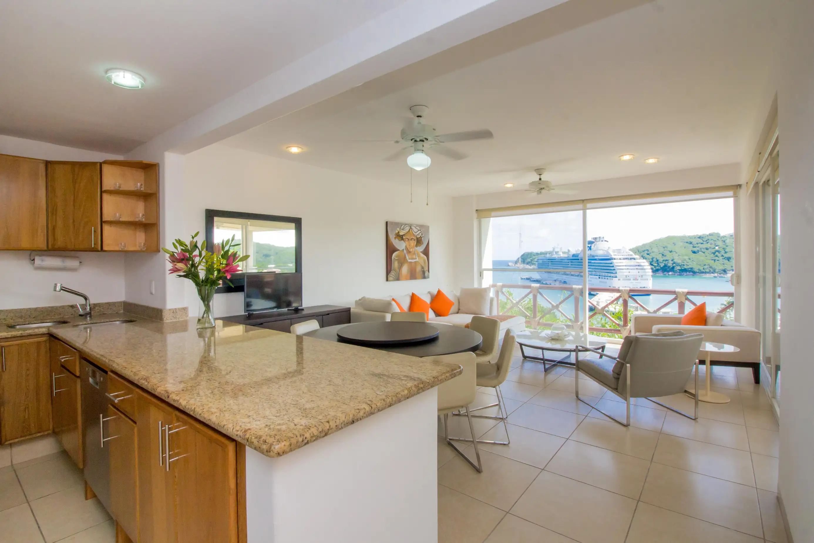 Arrive at the property and enjoy a fully equipped kitchen and comfortable living room area with a SMART TV and beautiful views of the Pacific waters of Marina Santa Cruz.