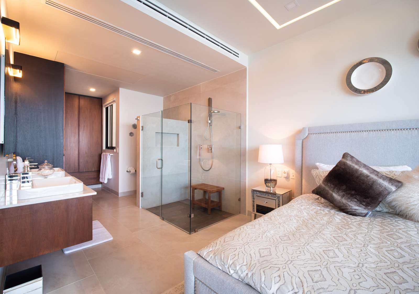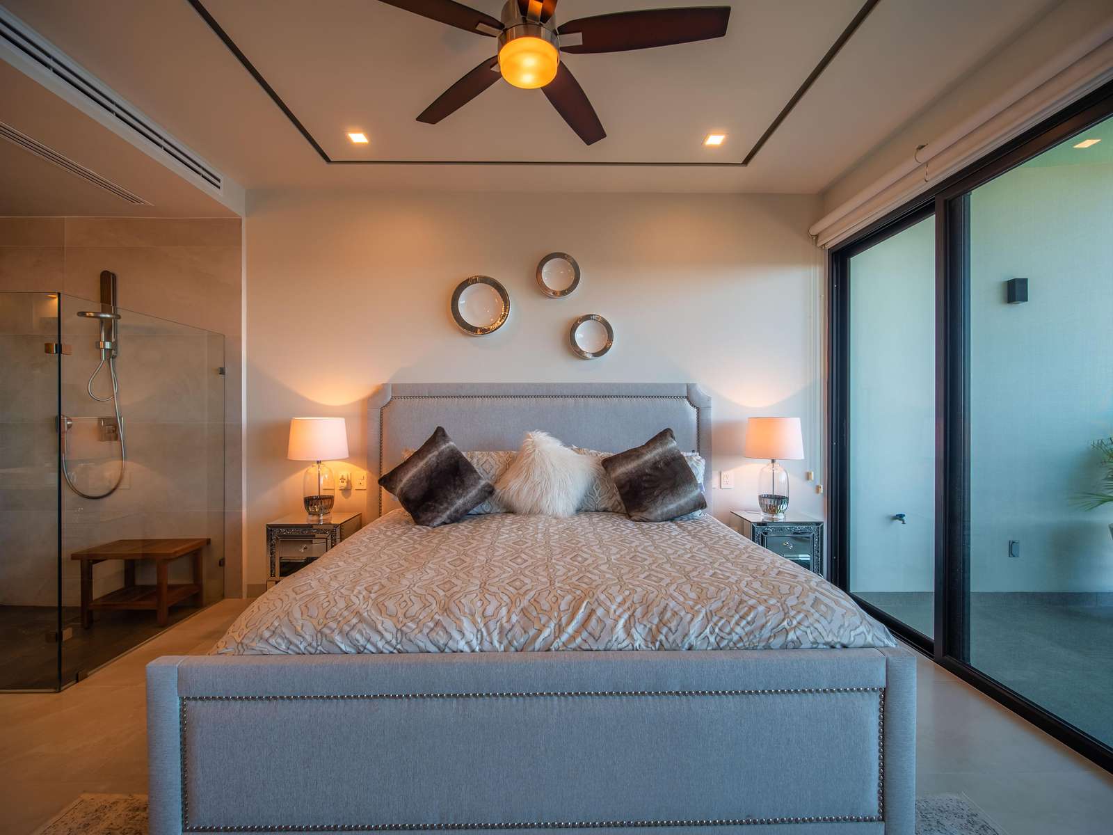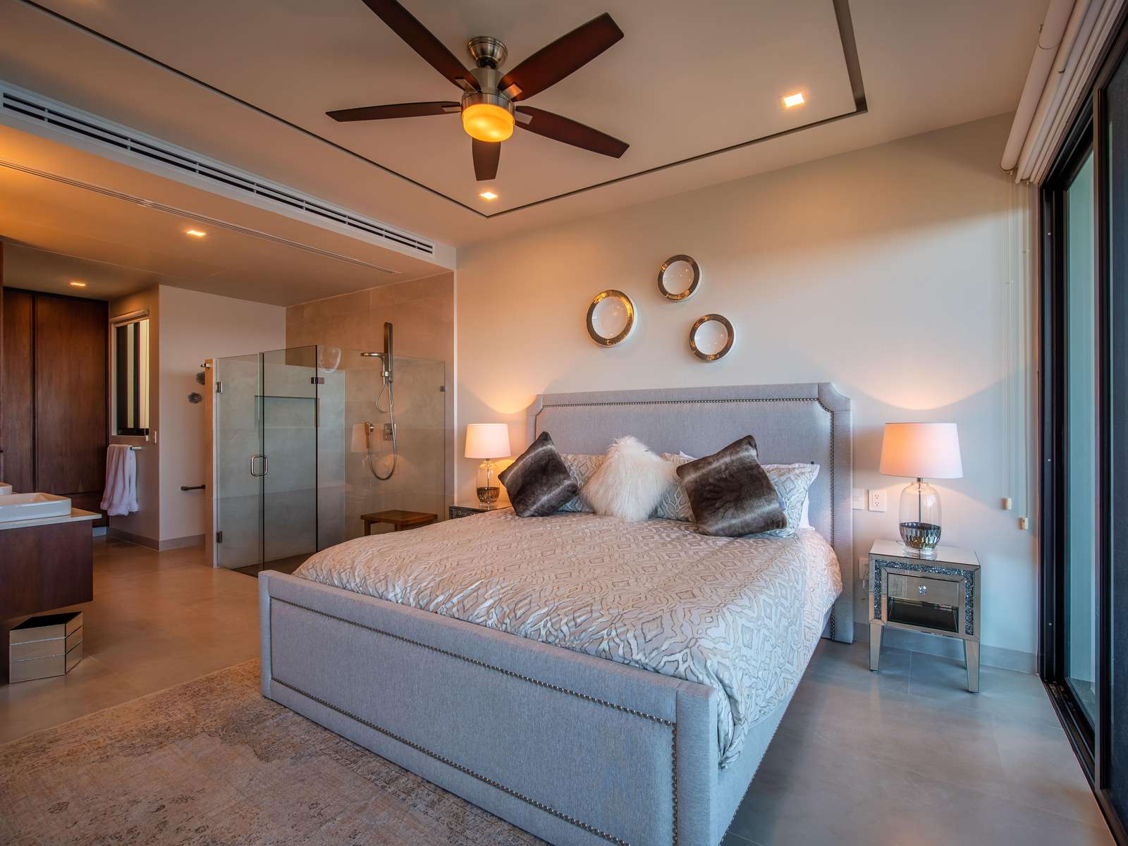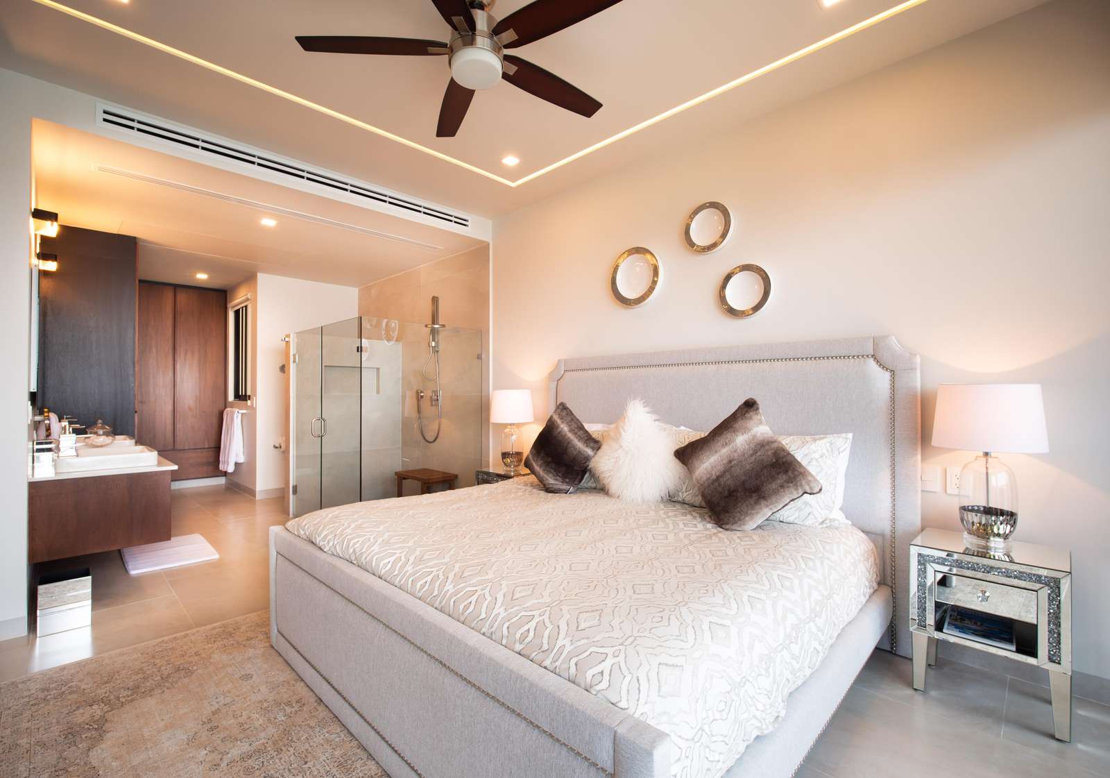 The primary bedroom offers a king-size bed, an ensuite bathroom, and sweeping ocean views. The second bedroom includes a California king bed for ultimate relaxation.