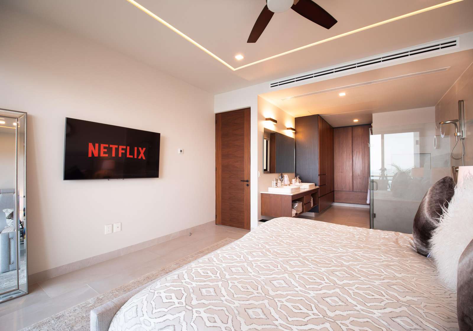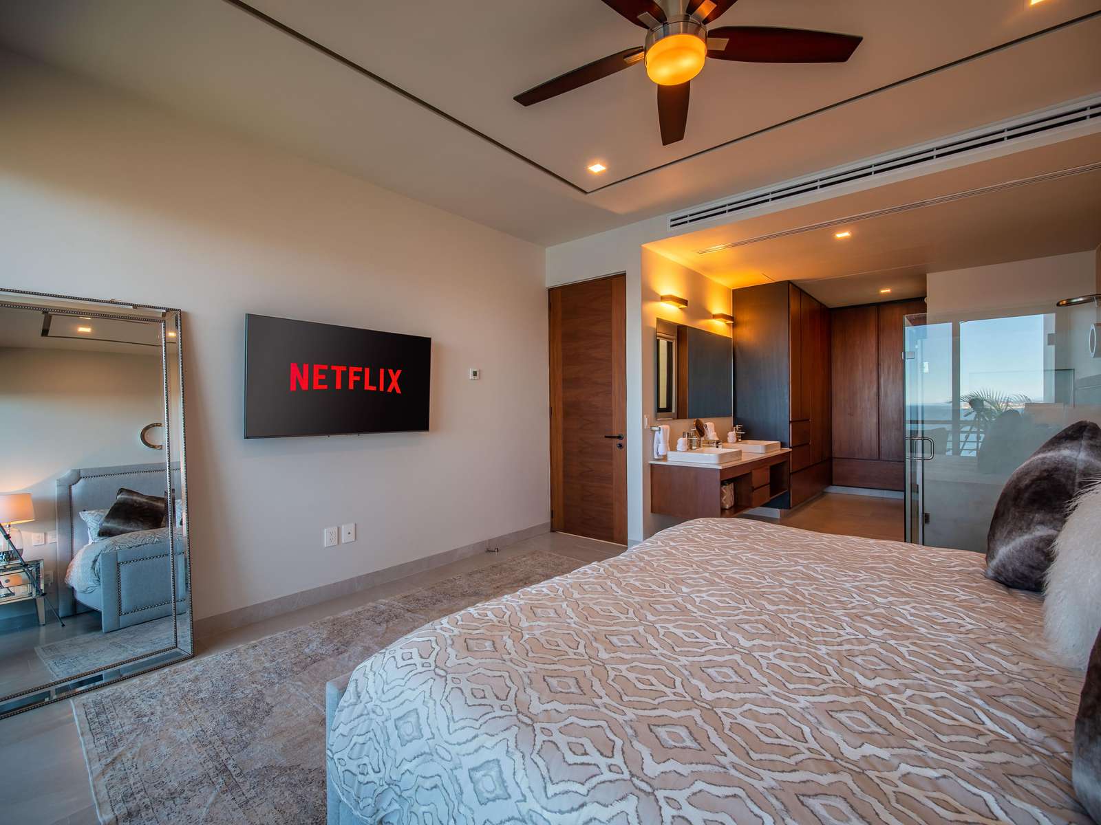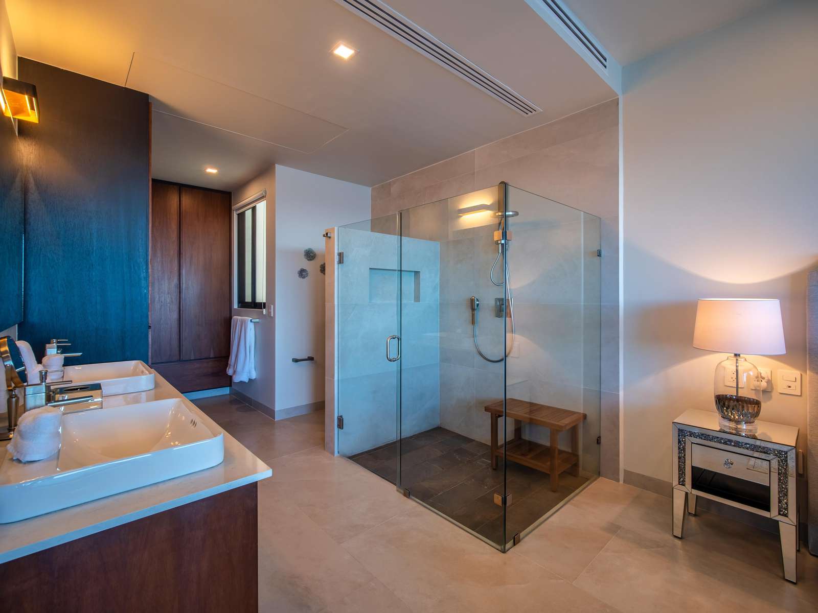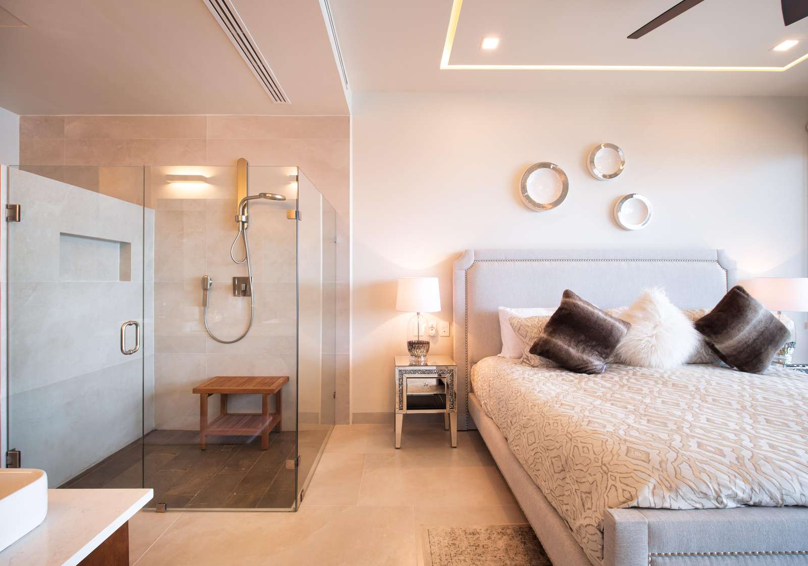 The primary bedroom offers a king-size bed, an ensuite bathroom, and sweeping ocean views. The second bedroom includes a California king bed for ultimate relaxation.