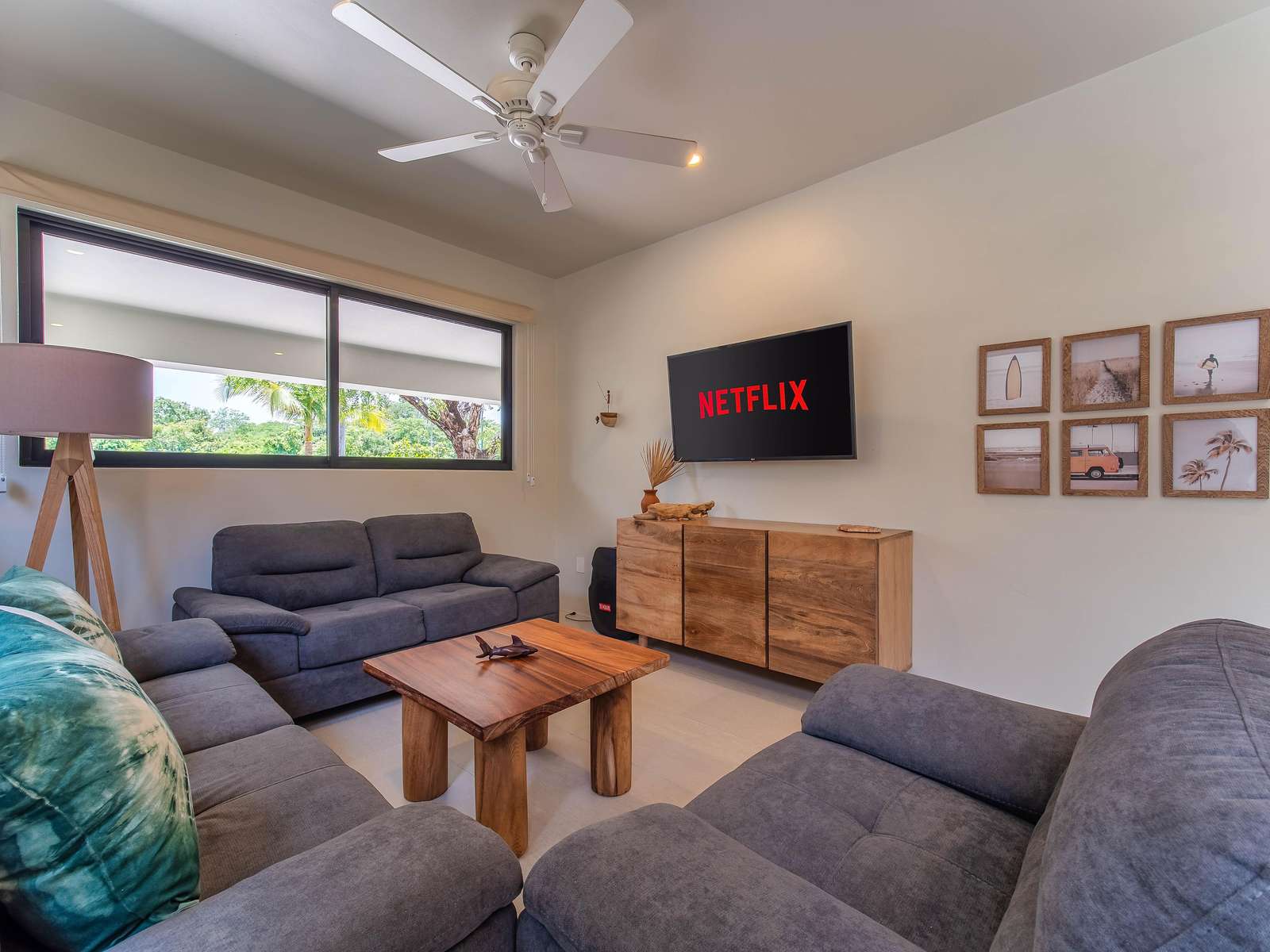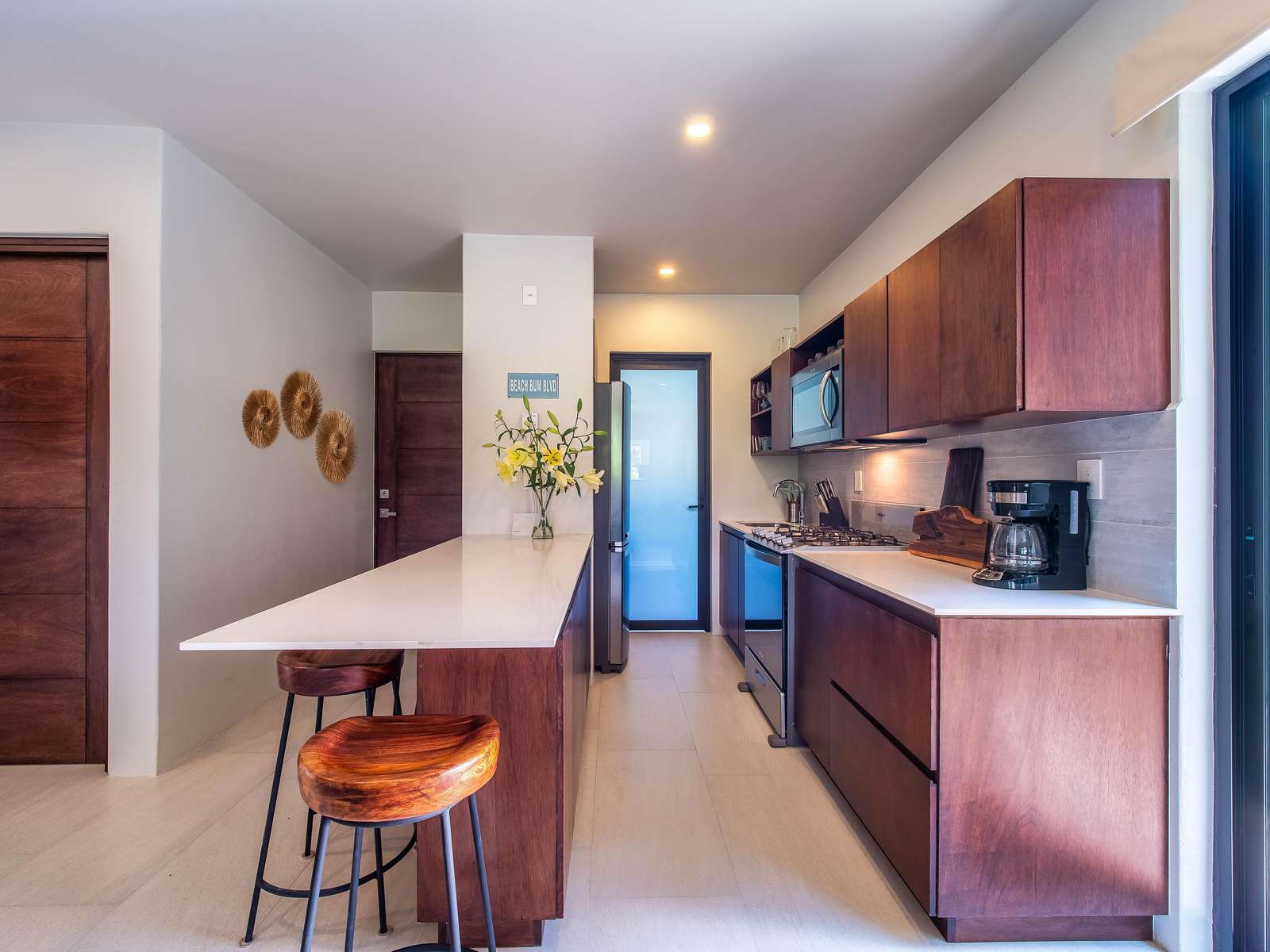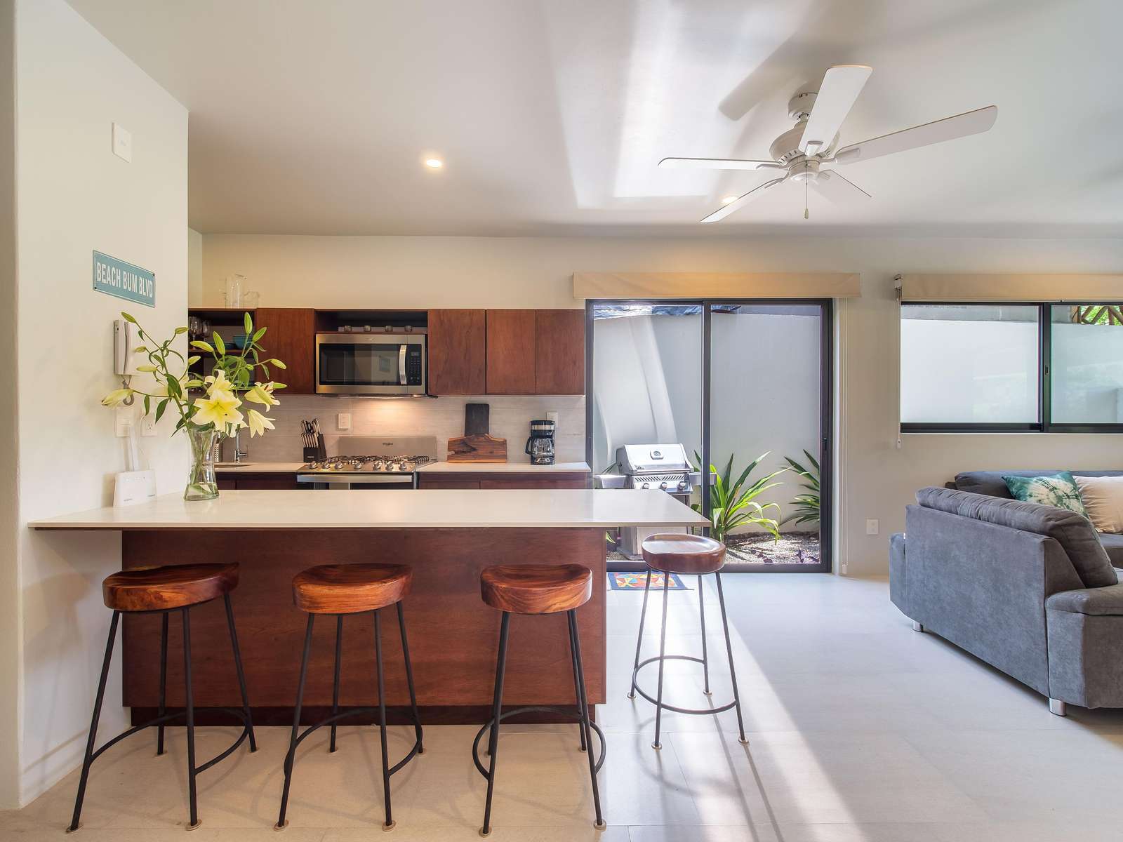 Inside, enjoy a fully equipped kitchen with island seating, a spacious living room with comfortable seating, and a SMART TV for relaxing after a day at the beach. Step outside to your private garden with lounge seating and BBQ—perfect for evening meals or morning coffee.